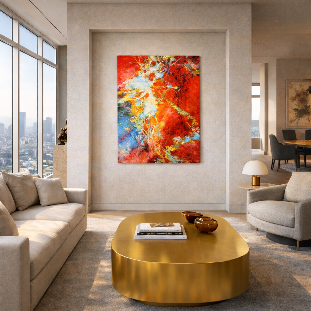 The painting explores the idea of inner movement — a quiet dynamism where vitality circulates smoothly within the space. Rather than depicting fire literally, Celestial Dance translates its essence into atmosphere, allowing the viewer to experience warmth, presence and emotional activation on a subtle level.